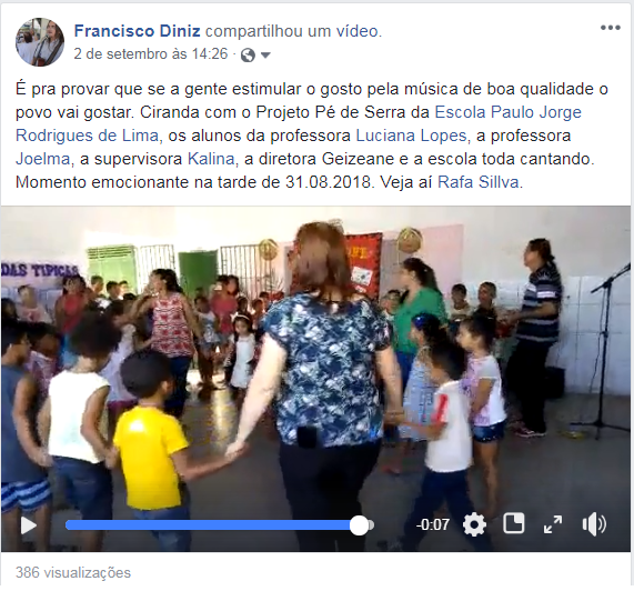 No sábado, 20.10.2018, as 20:00h na Feirinha de Tambaú, em João Pessoa. 8ª edição, de um total de 10, do Projeto Cordel, patrocinado pelo FMC 2017/2018 da capital da ParaÃba. Filmagens de Raimundo de Oliveira Silva, responsável pelo transporte das crianças da Escola Paulo Jorge Rodrigues de Lima e da Escola EmÃlia C. de Moraes Neta, de Lerolândia: José, Rafael Silva, Alessandro, Crisnaldo e Vitor. Participação do poeta cordelista José Pedro de Lima, das Flores Belas da Ong Pdnf: Daluz, Eurides e Penha, no coral, do meu filho Lauro, na zabumba, de Geldo Nogueira, no triângulo, de Lucas Lima, na sonorização, cujo equipamento foi cedido pela Ong Pro Dia Nascer Feliz, de Luiza Araujo.
